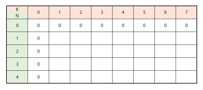 들 수 있는 무게(K)가 0이거나 물건의 개수(N)가 0이면 당연히 어떤 물건도 배낭에 넣을 수 없어 자동으로 가치합은 0이 된다. 위 사진은 그것을 나타내었다.