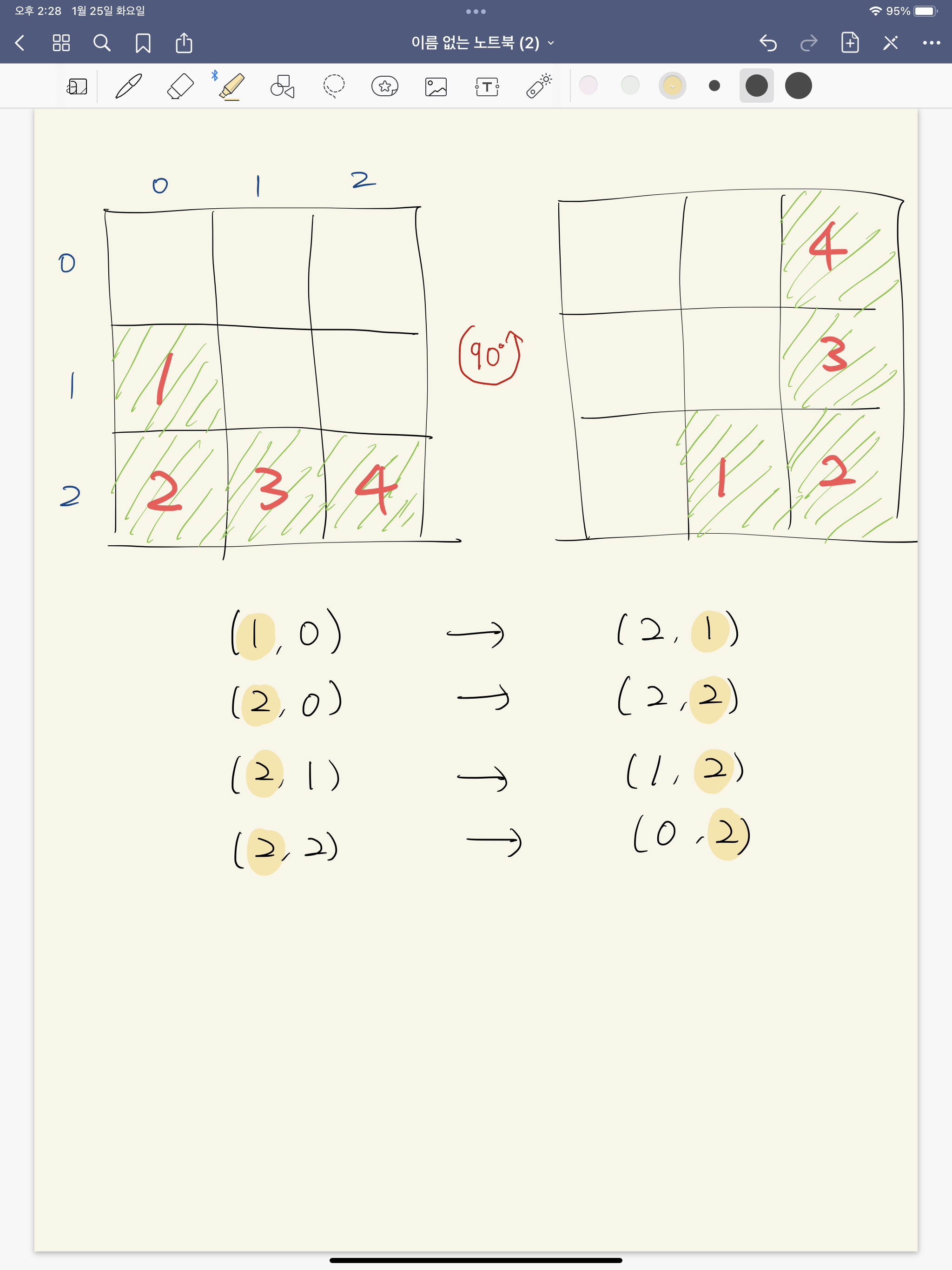 블록을 90도로 돌리는 것을 그려보았는데, 블록의 각 조각마다 대응되는 좌표를 찍어보니 규칙이 보이기 시작했다.